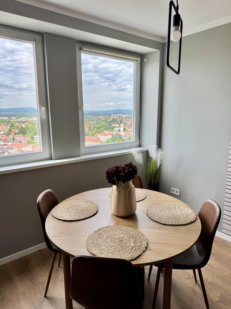 A Panorama View Apartman Veszprém központjában, a veszprémi vártól 600 méterre, városra néző kilátással várja vendégeit.Az apartman 1 hálószobával, nappalival, kádas fürdőszobával, étkezővel, és egy teljesen felszerelt, gépesített konyhával rendelkezik. Vendégeinket bekészített kapszulás kávé várja a szálláson. Gyermekek részére a nappaliban játszósarkot alakítottunk ki. Az apartmanban 4 vendéget tudunk kényelmesen elszállásolni a hálószobában lévő franciaágyon és a nappaliban lévő emeletes ágyon.A Veszprém Aréna 2,3 km-re, a legközelebbi balatoni strand pedig alig 10 km-re található. A város főbb rendezvényhelyszínei pár perces sétával elérhetőek.